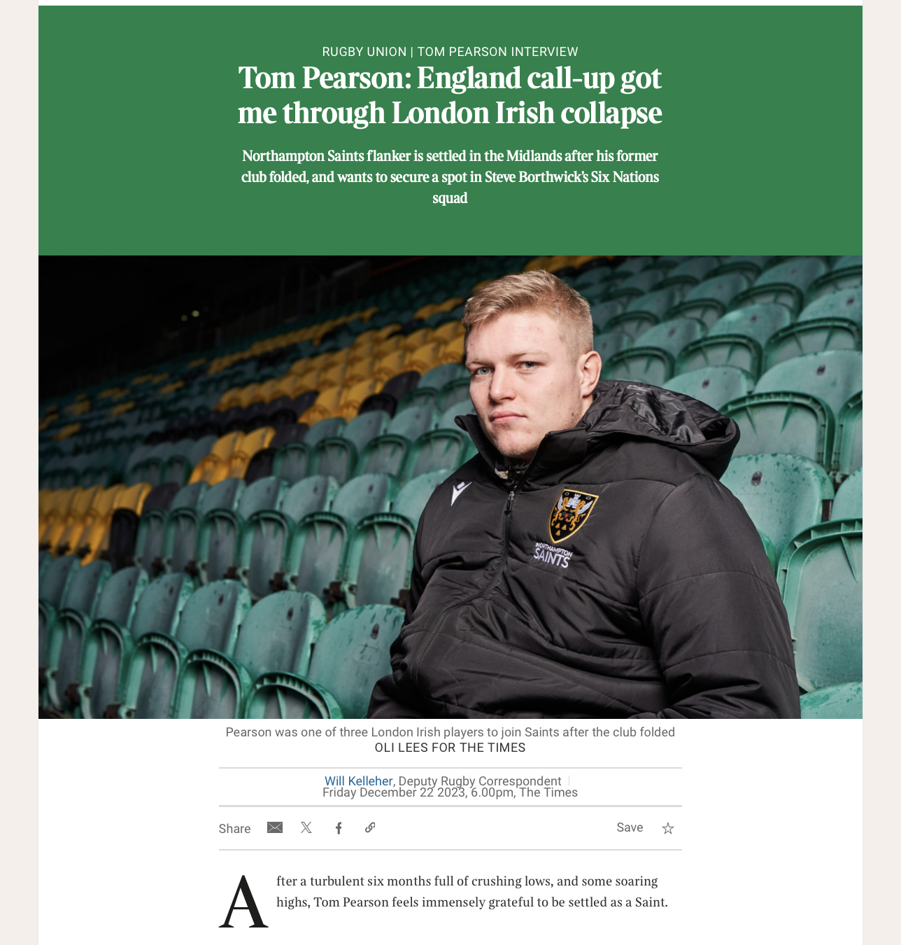 A young man sitting alone in green stadium seats with the Northampton Saints logo. He is wearing a gray jacket and black pants, with a serious expression. The background shows more seats with the team logo. The text discusses an interview about Eddie View fullsize