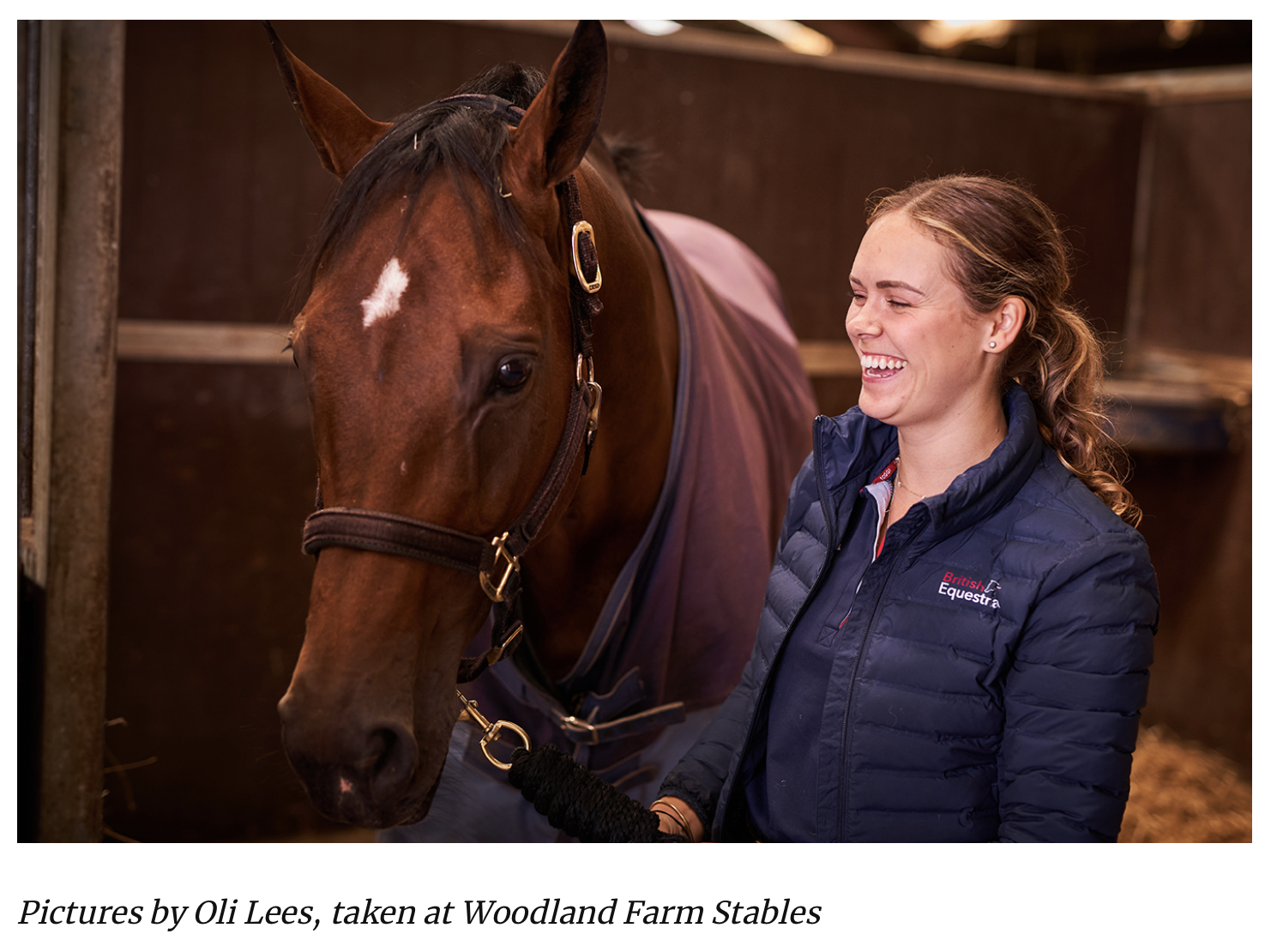 A woman with curly hair, wearing a navy Blue Puffer jacket with the logo "British Equestrian," smiling while holding a brown horse with a star-shaped marking on its forehead inside a stable.