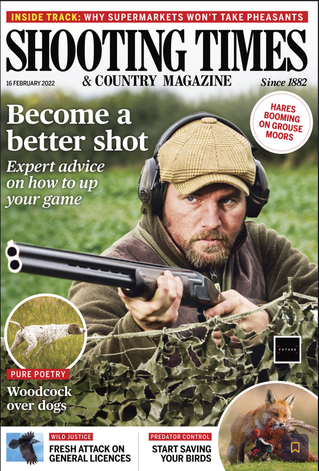 Magazine cover of Shooting Times & Country Magazine, dated May 25, 2022, featuring a man aiming a shotgun from a camouflaged hide in a field, with headlines related to hunting and shooting.