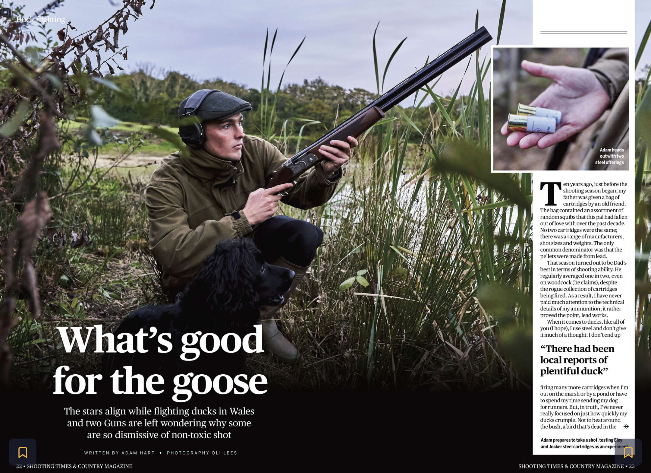 A man with a cap and vest walking in a field and a man shooting a shotgun in the background, with a person aiming a shotgun at flying birds in a field. There is a headline in the middle of the page that reads 'I cocked-up two shots; poor bird selecti View fullsize