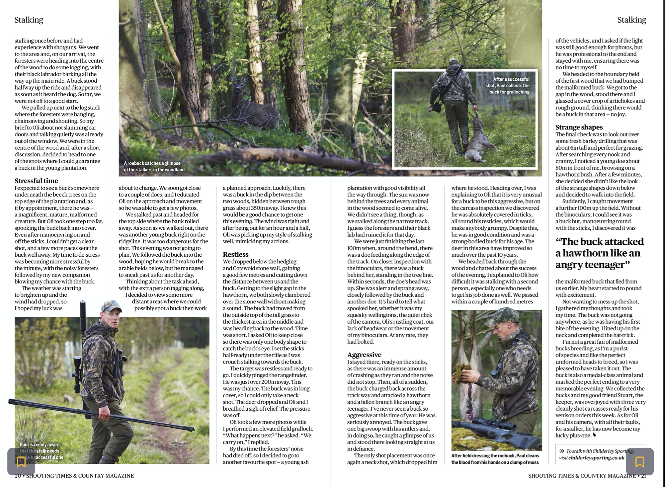 Magazine article page titled 'Stalking' with an image of a man using a scoped rifle on a bipod in a wooded area during sunset, and a smaller image of a person walking in a field with a deer carcass.