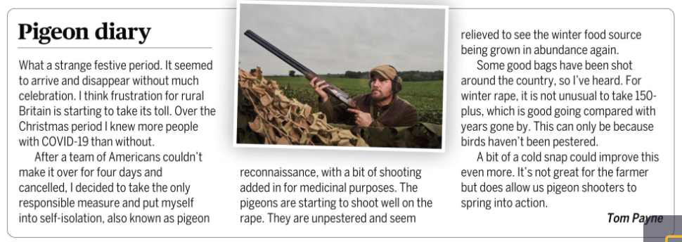 A man with a beard and cap aiming a shotgun from or near a trailer in a field, with two smaller inset images showing him setting up the trailer and standing in the field. An article about pigeon shooting is displayed on the page. View fullsize