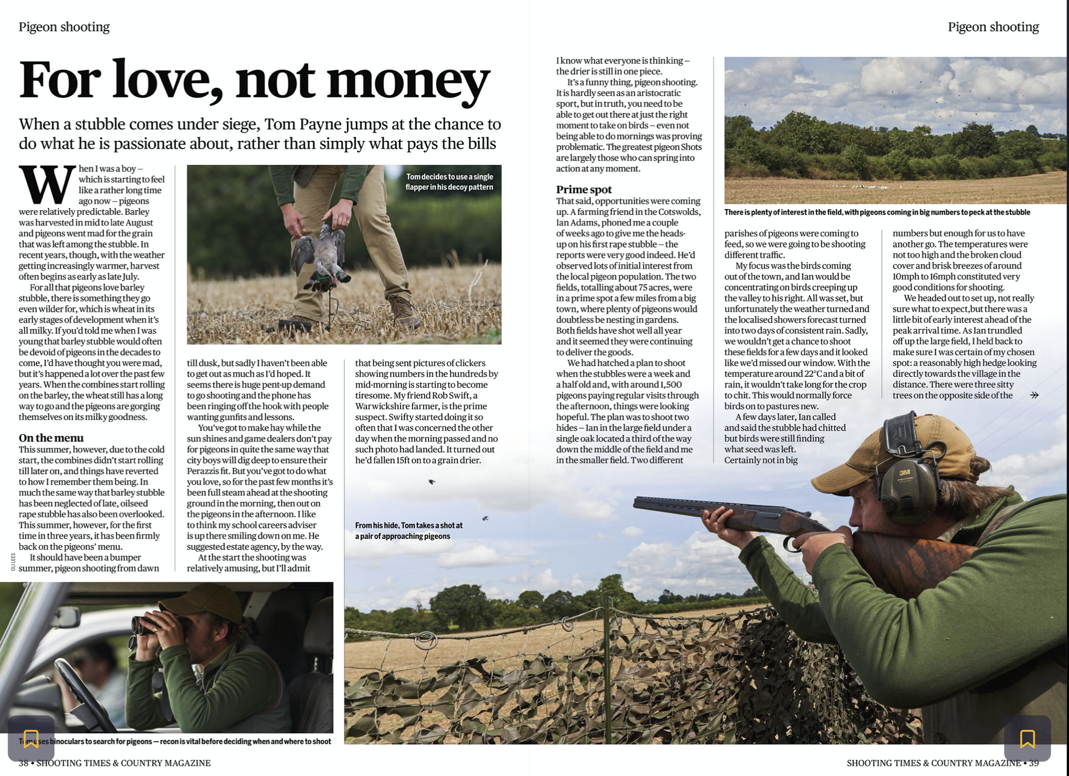Magazine page with text and images about pigeon shooting, featuring a man walking in a field carrying pigeons, and another man sitting with a shotgun aiming at birds. View fullsize