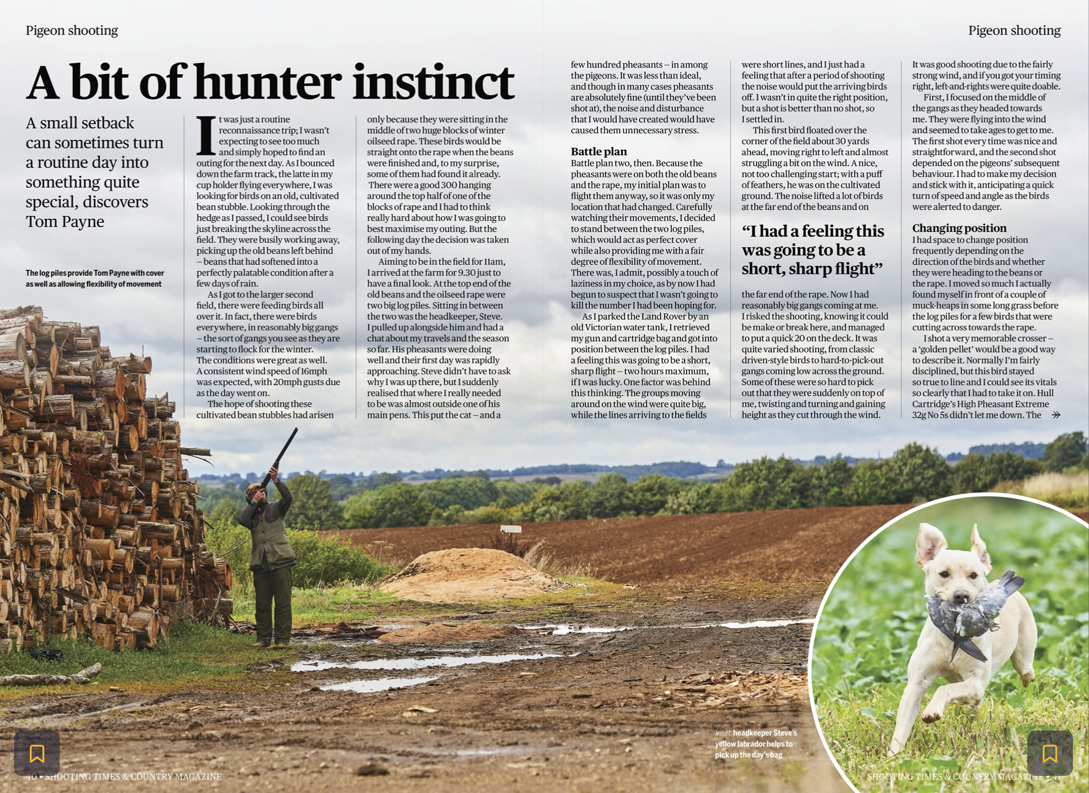 Magazine spread about pigeon shooting, showing a man shooting in a rural area with a large stack of chopped wood on the left and a yellow labrador carrying a pigeon in the lower right corner. The text discusses pigeon shooting and hunting techniques.