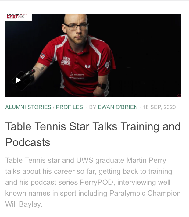 Screenshot of a webpage titled "Perry Retains European Title" from Scottish Disability Sport, featuring a photo of a man playing table tennis. View fullsize
