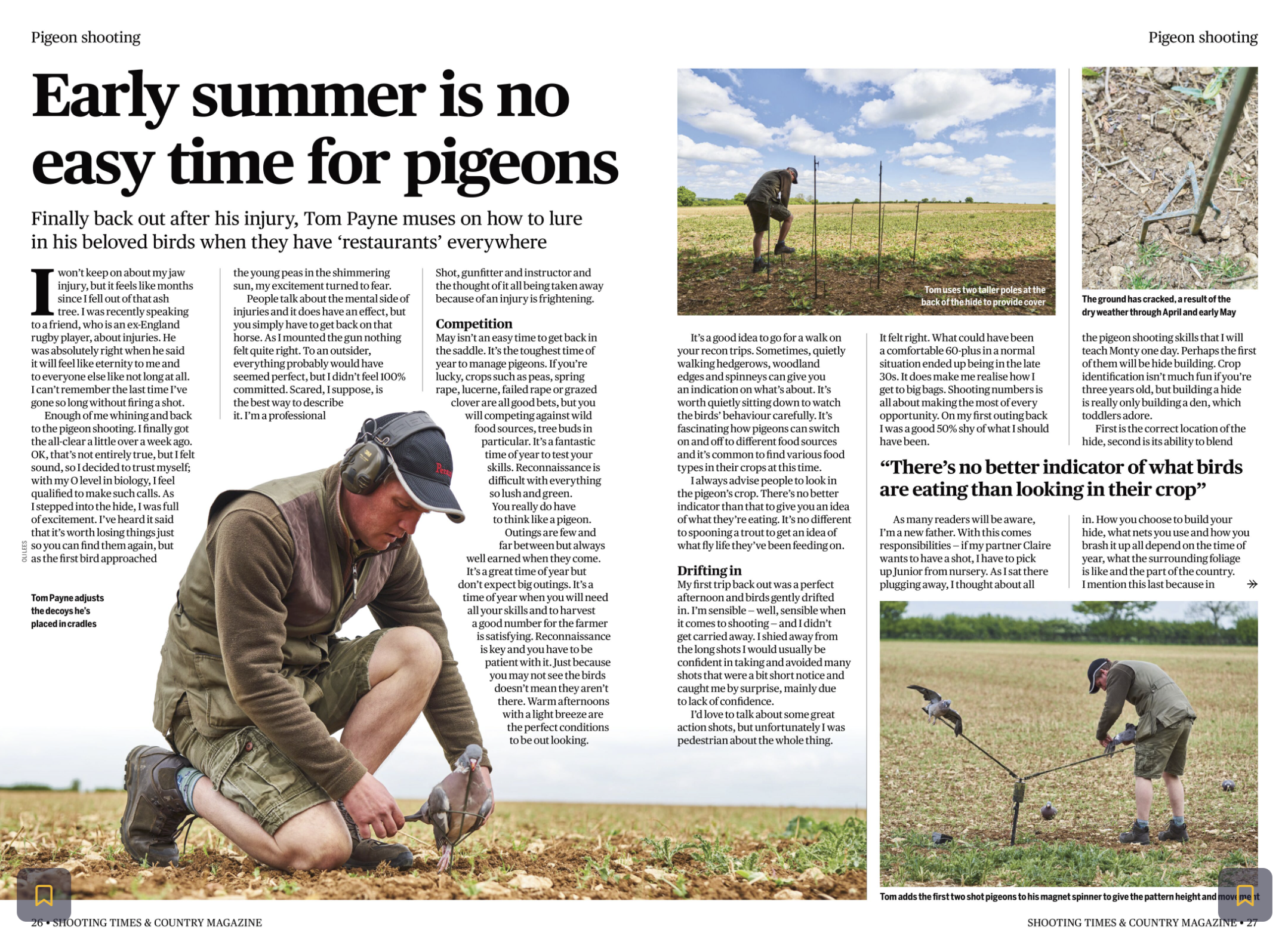 A man with a beard and cap aiming a shotgun from or near a trailer in a field, with two smaller inset images showing him setting up the trailer and standing in the field. An article about pigeon shooting is displayed on the page.